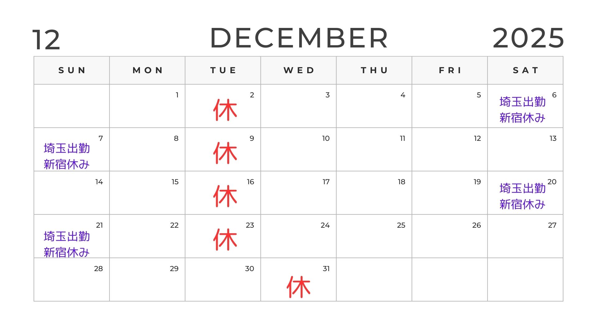 2025年12月の休みとリミックス新宿、埼玉杉戸美容室インティの出勤のお知らせです。